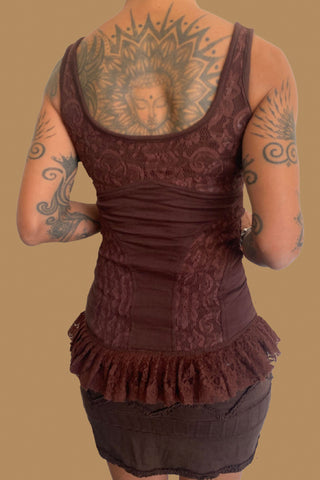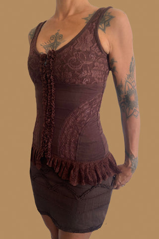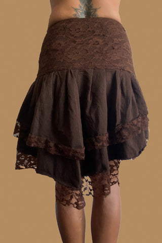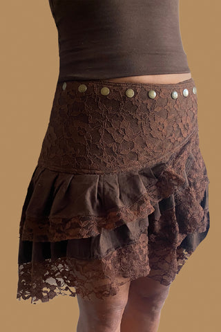 Women Mini Skirt with Elastic waist belt and stretch Lace WITNESS Dark Brown