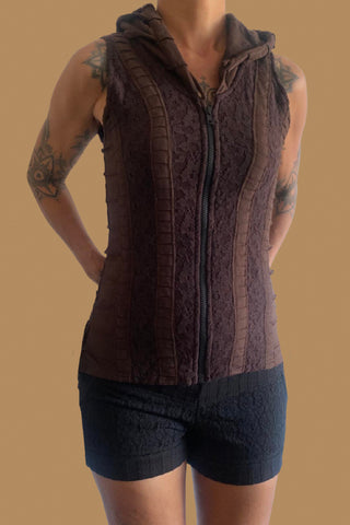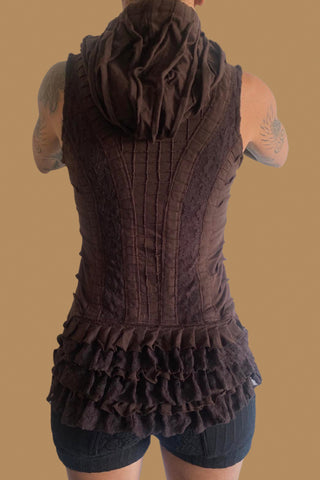 Women Intricate Hooded Vest with front zipper and lateral Pockets CHIC Dark Brown