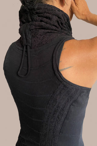 Women Intricate Hooded Vest with front zipper and lateral Pockets CHIC Black
